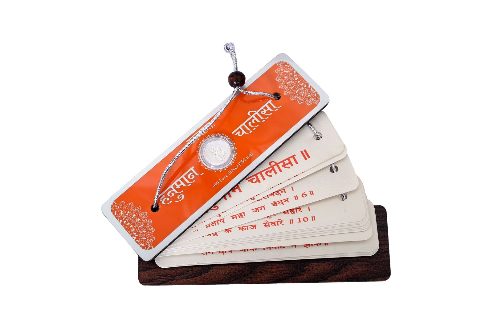Premium Silver Coin Hanuman Chalisa with wooden engraved cover. High-demand devotional gift item suitable for retail, gifting, festivals & bulk sales. Compact packaging with excellent resale value.